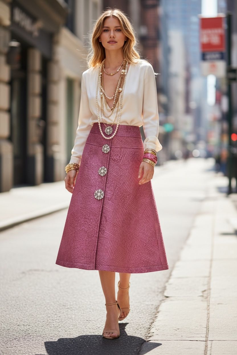 Ogni gonna nasce artigianalmente. Seleziono i tessuti uno a uno — sete, broccati, pelle, paillettes — e lavoro con laboratori italiani e stampatori di Como. Molti tessuti sono realizzati in esclusiva per la mia collezione.